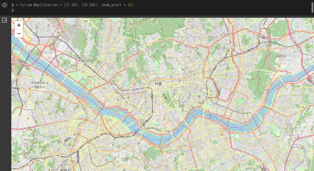 기본적으로 지도를 시각화하는 방법이다. tiles 매개변수로 지도의 형태를 다양하게 바꿀 수 있다.