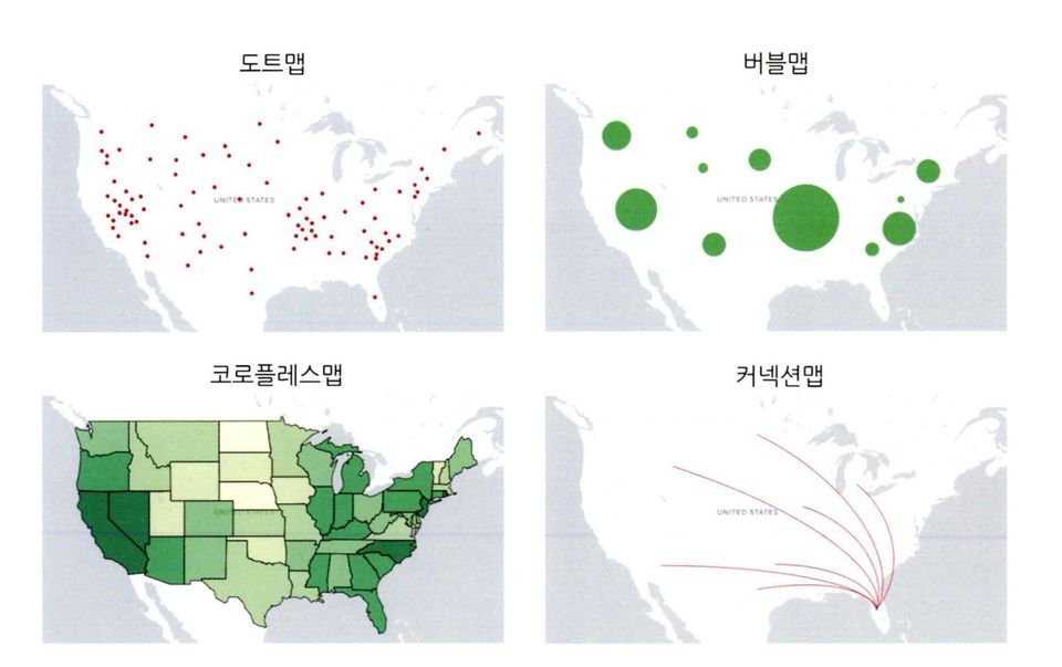 - 커넥션맵 : 링크맵이라고도 하며 지도에 찍힌 점들을 직선 혹은 곡선으로 연결하는 기법이다. 여러 점을 한 선으로 연결해 경로를 표시할 수도