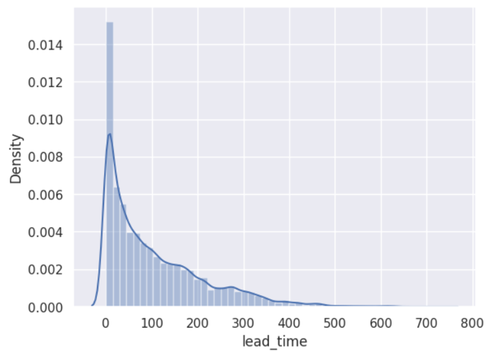 violinplot() : 호텔 구분에 따른 lead_time 칼럼 분포를 시각화할 수 있다.