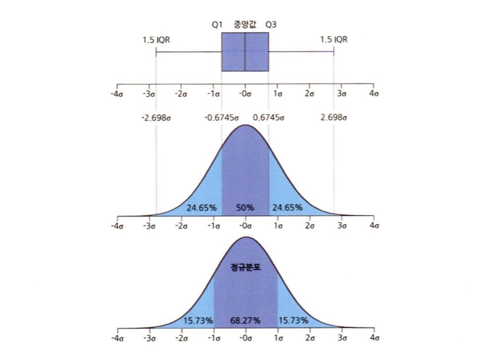 박스 플롯의 데이터 분포와 정규분포를 비교해 보면 박스 플롯의 박스 부분은 정규분포의 평균을 중심으로 좌우 1표준편차 안에 측정된 관측치 양과 비슷하고 양쪽 수염의 끝까지는 정규분포에서 평균의 좌우 3표준편차 안에 측정된 관측치 양과 유사하다는 것을 알 수 있다.