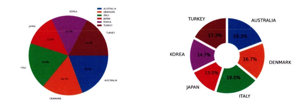 변수의 구성이 단순한 경우에는 파이차트 혹은 도넛차트를 사용한다. 이들은 구성 요소들의 분포 정도를 면적(혹은 각도)으로 표시한다. 비율을 수치로 같이 입력해 주는 것이 좋다.