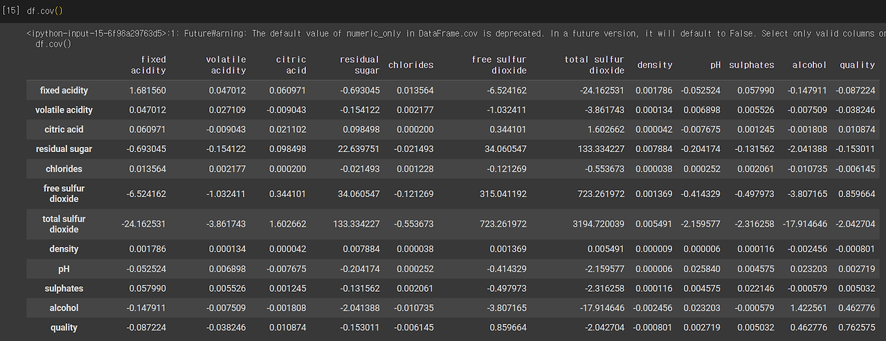cov() 함수를 통해 공분산을 구해 표로 정리해 나타낸다 .