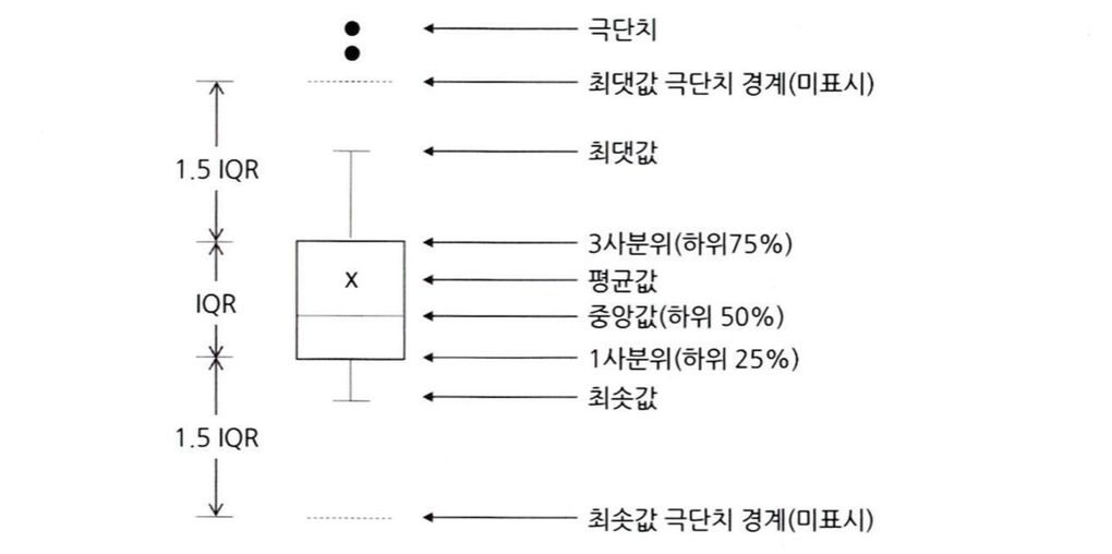 - 최댓값 : 제3사분위에서 1.5 IQR을 더한 위치까지의