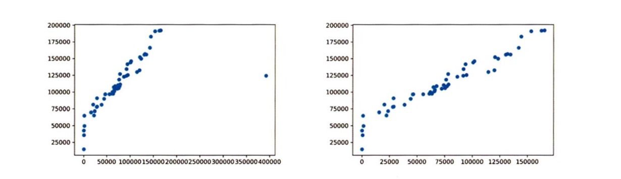 산점도를 이용해 두 변수 간의 관계를 나타낼떄, 극단치가 있다면 이를 제거하고 그래프를 그리는 것이 좋다.