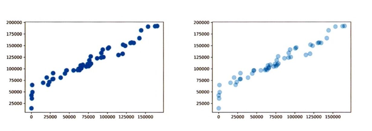 또한 산점도에서 데이터가 너무 많아 점끼리 겹쳐 정보를 확인하기 힘들 때 점들에 투명도를 주어 밀도를 함께 확인할 수 있다.