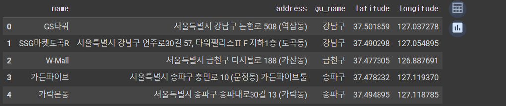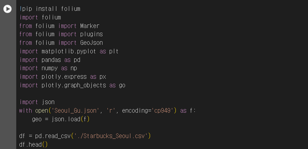 필요한 패키지를 임포트하고 파일을 업로드했다. geo 변수에는 서울 각 구의 경계를 표현해 줄 수 있는 파일을 업로드했다.