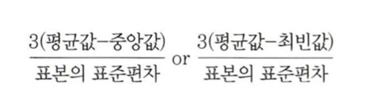 데이터 분포의 좌우 비대칭도를 표현하는 척도이며 데이터 분포가 좌우 대칭일수록 왜도값은 감소, 편향되어 있을수록 왜도값은 증가한다. 또한 분포가 왼쪽으로 치우쳐 오른쪽으로 긴 꼬리를 가지면 양수, 반대의 경우 음수가 된다.