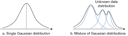 혼합 가우시안(Mixture of Gaussians):GMM은 여러 개의 가우시안 분포가 혼합된 모델로서, 각 가우시안 분포가 하나의 클러스터를 나타낸다. 따라서 데이터는 여러 개의 가우시안 분포로부터 생성될 수 있으며, 이러한 혼합 가우시안을 통해 다양한 형태의 데이터를 모델링할 수 있다.