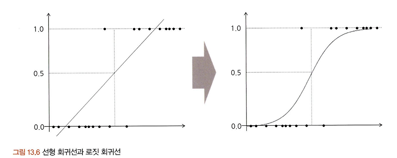로짓 회귀선으로 변환해주기 위해 오즈 값을 구해야 한다. 오즈 값에 로그를 취한 뒤 로짓 변환하여 0에서 1 사이로 치환해줘야 한다. 이를 시그모이드 함수라고 한다.