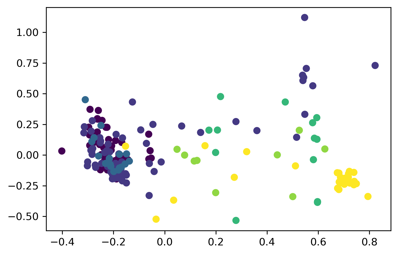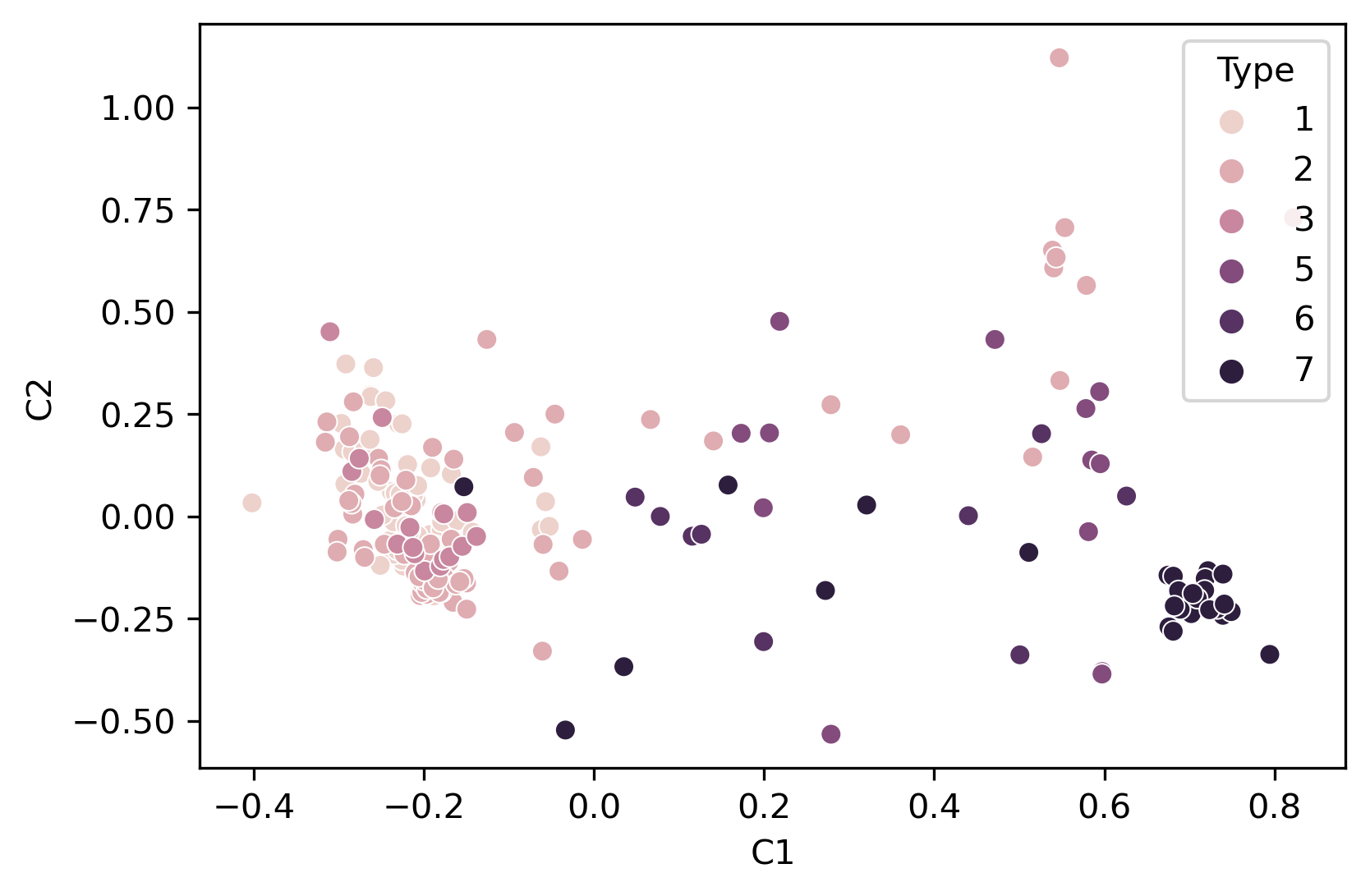 c1,c2를 x,y축으로 하여 종속변수인 type가 어떻게 분포하는지 확인.