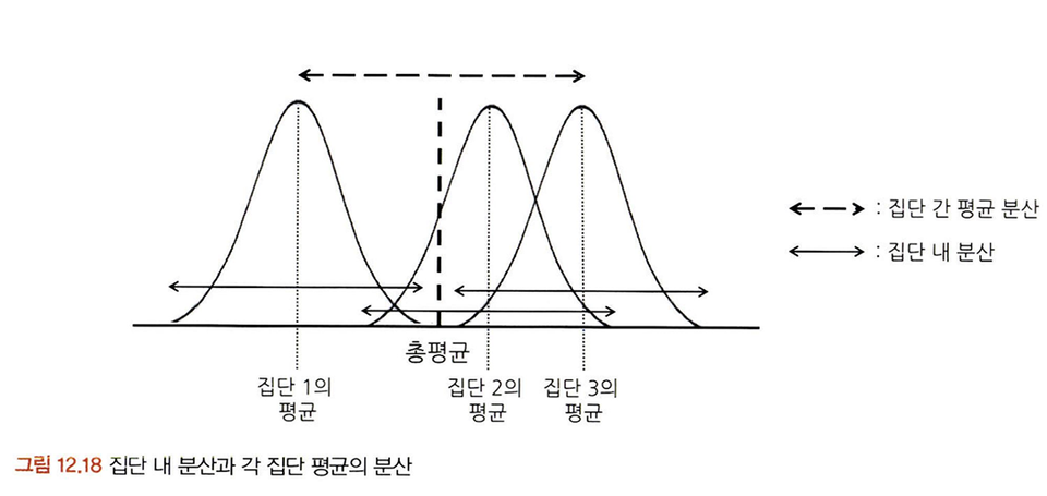 ANOVA는 각 집단의 평균값 차이가 통계적으로 유의한지 검증한다. 집단 내의 각 관측치들이 집단 평균으로부터 얼마나 퍼져 있는지를 나타내는 분산, 즉 집단 내 분산이 사용되며 전체 집단의 통합 평균과 각 집단의 평균값이 얼마나 퍼져 있는지를 나타내는 집단 간 평균의 분산이 사용된다.