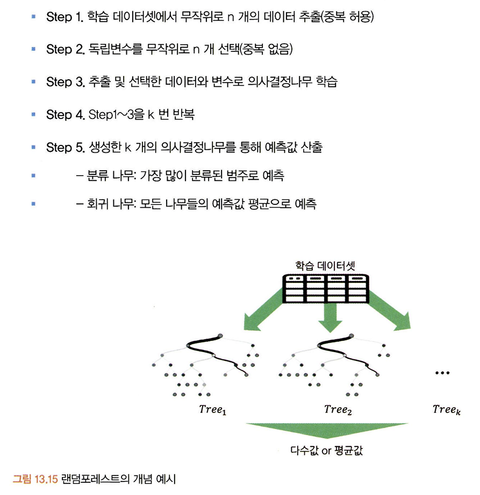 이러한 보정을 하더라도 학습 성능의 변동이 크다는 고질적인 문제가 있기 때문에 나온 모델이 랜덤포레스트이다. 나무를 여러개 만들어 학습하게 되면 다양한 상황을 고려하여 학습이 되기 때문에 과적합을 방지할 수 있다. 집단지성과 같은 개념으로, 앙상블 학습(Ensemble learning)이라고도 한다.