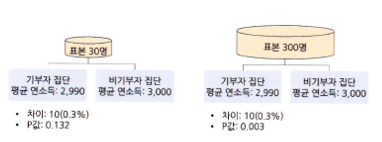 - 기부여부에 따른 연 소득 차이는 10만원으로 같음에도 불구하고, 표본을 증가시킨 것만으로 유의확률이 조정