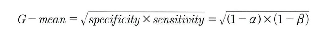 기하평균을 사용해 민감도와 특이도의 평균을 구하는데, 이는 실제 1을 제대로 분류한 비율과 실제 0을 제대로 분류한 비율의 기하평균