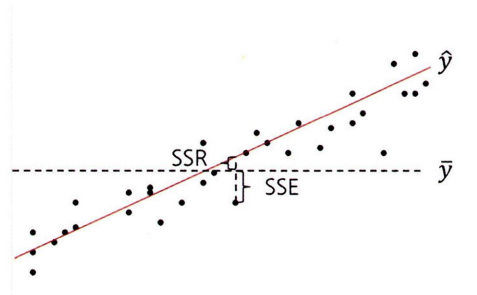-> 회귀모델의 회귀선이 종속변수 y값을 얼마나 잘 설명할 수 있는가를 의미