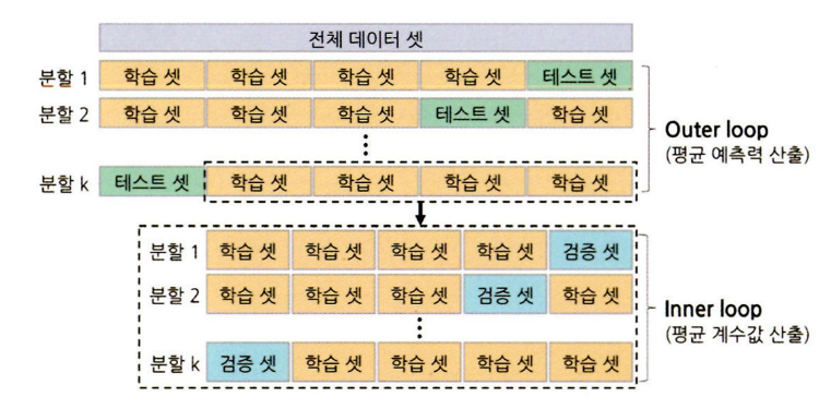 -> k-fold를 이중으로 중첩하여 사용하므로 inner loop와 outer loop로 구성됨