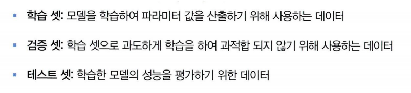 -> 정답지가 있는 학습 셋과 검증 셋 데이터로 모델을 만들고, 모델을 테스트 셋 데이터에 적용하여 산출한 예측값을 테스트 셋 레이블과 비교하여 모델 성능 평가