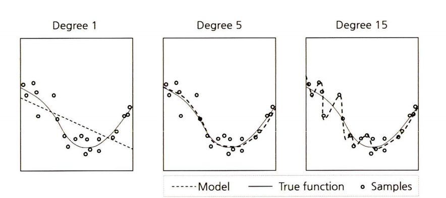 Degree 1 : 모델이 너무 단순해서 Y값을 제대로 예측하지 못함, 학습이 너무 덜 된 경우 과소적합(underfitting)
